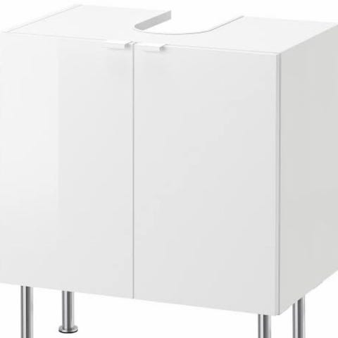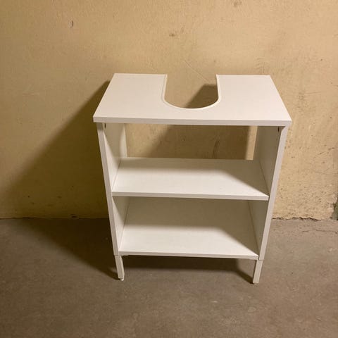 Underskåp i vitt med två dörrar och metallben. Skåpet har en utskärning upptill för exempelvis rör eller annan installation. Ytan visar viss skada med små märken och repor. Passar för förvaring i badrum eller liknande utrymmen.