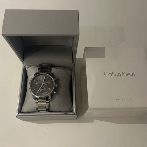Calvin Klein herrklocka i rostfritt stål med metallarmband. Klockan har en rund urtavla med flera mindre urtavlor och knappar på sidan för justering. Designen är i en silverfärgad ton och är avsedd för män.