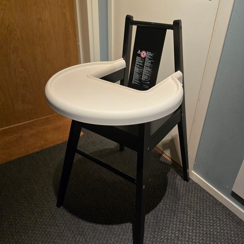 Barnmatstol från IKEA modell blåmes. Stolen är väldigt bra skick är i trä, brickan är i plast och är avtagbar. Medföljer bälte. Finns i Huskvarna.