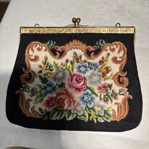 Svart sammet med typ broderad framsida. Tre små innerfack och flätat band för att hålla över axel om så önskas.