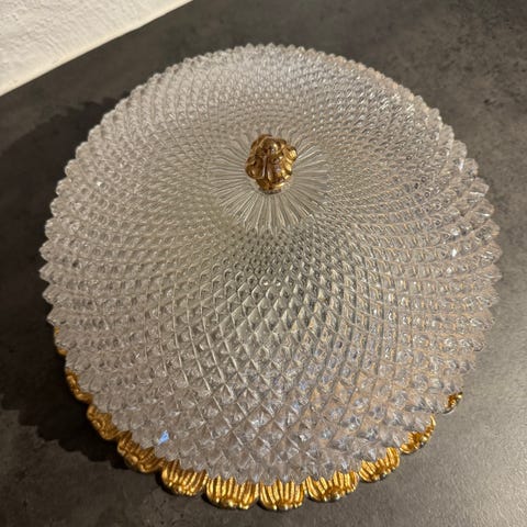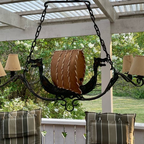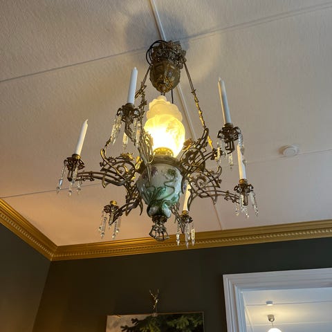 Svart taklampa I plåt. Ursprungligen med stearinljus nu med el som kan tändas med 2, 4 eller alla 6 lampor.