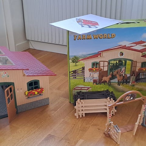 Säljer ett Schleich stall. Allt är i fint skick och har använts varsamt. Inkluderar Svart- och Vitfläckig Häst med svart täcke, Vit/Ljusbeige Häst med rosa täcke, Mörkbrun/Svart Häst med svart och rosa täcke, Litet Föl mörkbrun/svart, gräddfärgad Häst drar en vagn, Mörk Häst med stort grönt täcke, Brun Häst och en Vit och Brun Häst. Alltså 8 hästar. Det ingår även en förare som sitter på vagnen, en ryttare, en Åsna och en katt. Tillbehören är Grön Skottkärra, Gul låda, Blå Hink, Högaffel/Redskap, hö, foder Sadelställ, sadlar och Träns och korgar med frukt. Det kommer också 3 olika hagar (Vit, Brun och ljusbrun) samt två hinder.