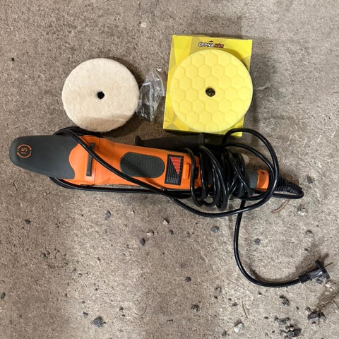 Lixada polermaskin i gul färg. Elektrisk maskin avsedd för polering med rund slipplatta. Handtag med grepp för enkel användning.