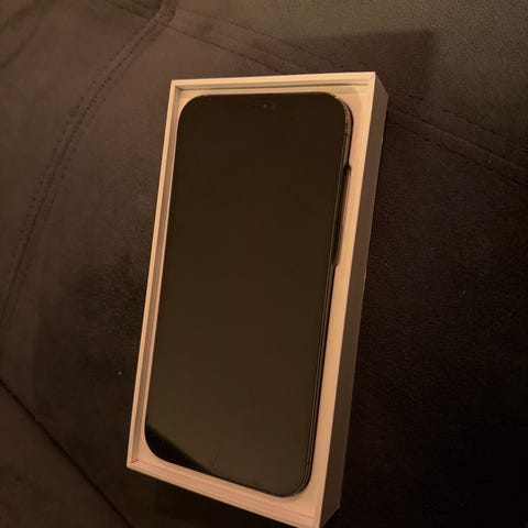 Apple iPhone 12 Pro Max mobiltelefon med 256 GB lagringsutrymme. Enheten har en svart färg och är utrustad med flera kameror på baksidan. Levereras med originalförpackning och skyddande skal.