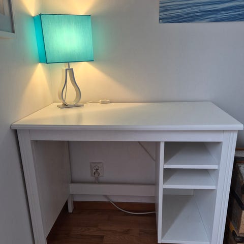 Ett väldigt fint och praktiskt skrivbord med hyllplan. Möbeln ställs mot väggen eller kan väggfästas. Tar inte mycket plats och är väldigt smidigt och användbart. Skrivbordet har två hyllplan ovanför arbetsytan för förvaring och organisering. Passar för hemmakontor, pyssel eller studier