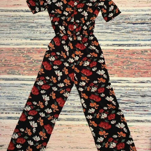 OBS: Något lös/längre tråd på enstaka av knapparna (se de 2 på bild på näst sista och näst näst sista bilden). Köparen godkänner detta när de köper klädesplagget. Syns inte så mycket när man har jumpsuiten på sig med knapparna stängda men kan ev behövas ”tightas till”.
