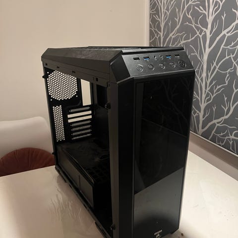 Stilrent vitt chassi med glas-sidor och bra luftflöde. Har en fin specialfläkt med blommönster