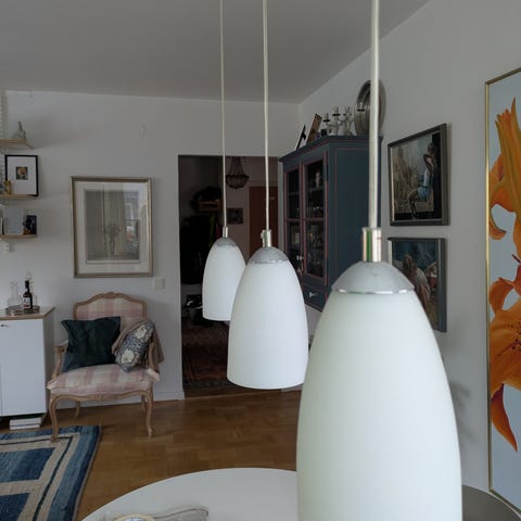 Två vackra munblåsta glaspendlar upphängning anpassade för högt i tak men det går att justera efter eget behov.