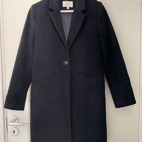 Mörkgrå, halvlång, lätt figursydd ullkappa i storlek L, inköpt på Lindex. Använd endast fåtal gånger.