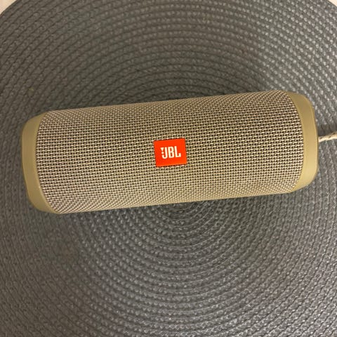 JBL högtalare i vit färg med bärrem. Designad för portabel användning med enkel kontrollpanel inklusive ström- och Bluetooth-knappar. Kompakt och lätt att bära med sig.