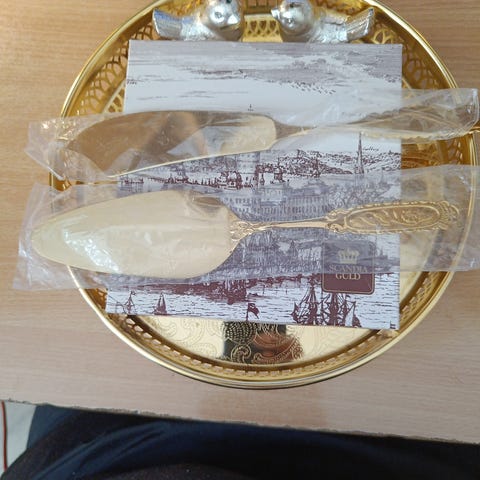 Tretandad gaffel i trä + signerad tårtspade i trä från 1986