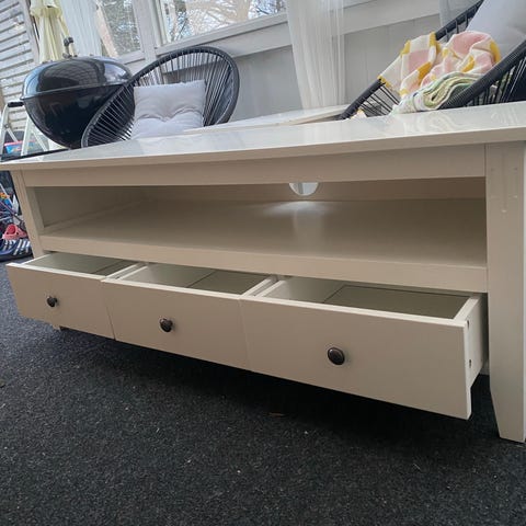 Fin TV bänk med två lådor och hyllplan som kan justeras i höjd i tre steg.