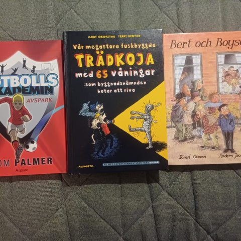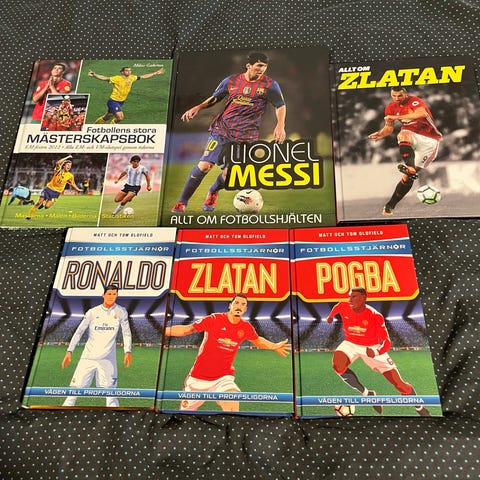 Böcker om fotboll enligt bild, både fakta och skönlitterärt. En av böckerna mycket solblekt, se bild.