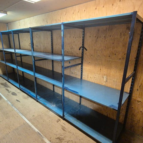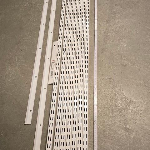 Metallhylla med fyra hyllplan i rostfritt stål. Hyllan är väggmonterad och har justerbara hyllplan. Passar för förvaring och organisering i olika miljöer såsom garage, verkstad eller lager. I priset ingår väggskenor ca 225cm långa samt fyra hyllplan med längd 321,5cm och djup 40cm.