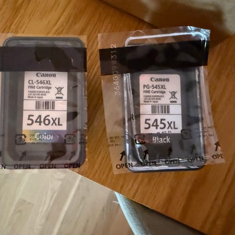 4 gånger 1 ny oöppnad sats original förpackade black patroner till Canon skrivare Pixma TS5055. Skrivaren gick sönder och nu är black kvar som inte kan användas till annan skrivare! 1 sats 200kr
