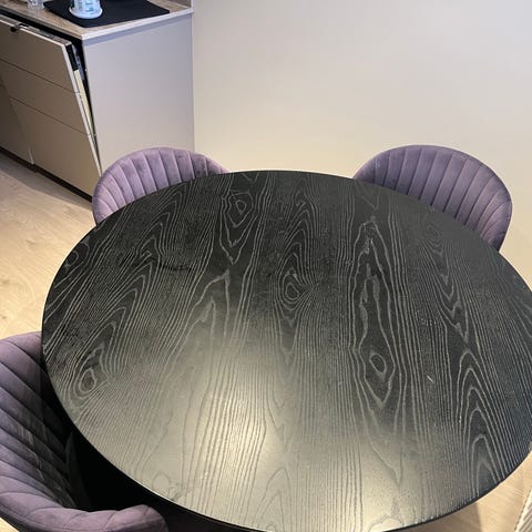 Matbord med fyra stolar från Mio i väl använt skick säljes till paketpris. Bordsskiva är lite flammig/har någon små lackskador. Bordsskivan 130x80 cm. Uppfällbar klaff så bordet förlängs med 45 cm