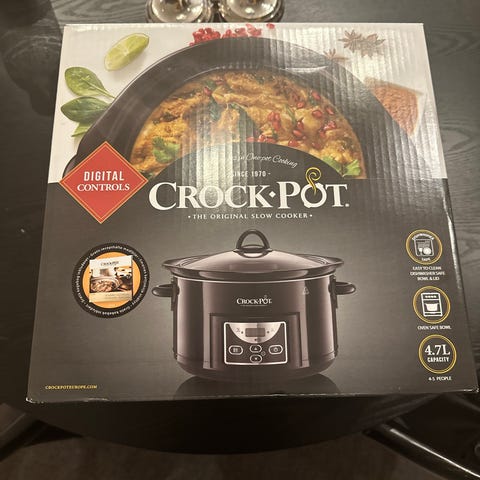 Crock-Pot Slow Cooker med en kapacitet på 4,7 liter. Produkten är svart och lämpad för långsam tillagning av mat.