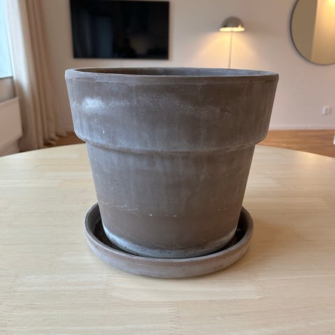En stor kruka från DBKD. 24,5 cm i diameter och 22,5 cm hög. Krukan har spruckit och är limmad invändigt. Man kan se sprickan utifrån men vi har haft det vinklat in mot fönstret vilket gör att det inte stört oss.