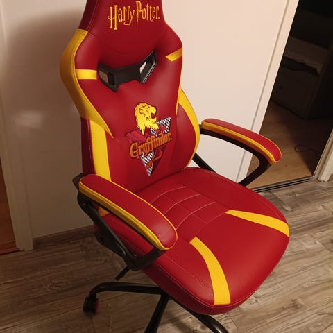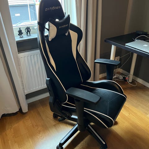 2st gamingstolar. Den ena har ett skadat armstöd och behöver en rengöring, den andra har en dålig spärr på ryggstödets lutning. Om man lutar sig bakåt så hoppar spärren förr eller senare ur och man åker en bit bakåt innan den låser igen.