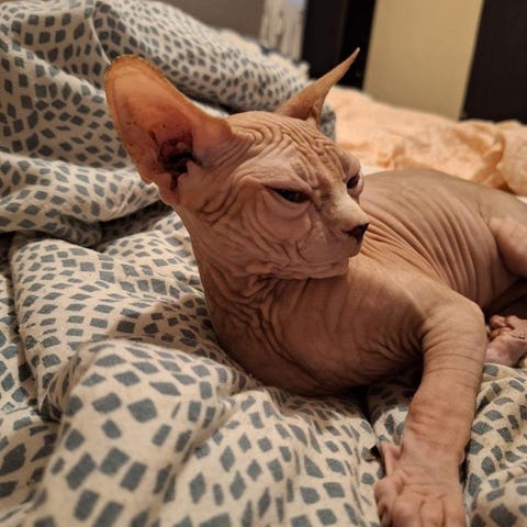 Nu söker denna underbara sphynx-hona ett nytt kärleksfullt hem. Hon är 3 år gammal, okastrerad och har stamtavla.