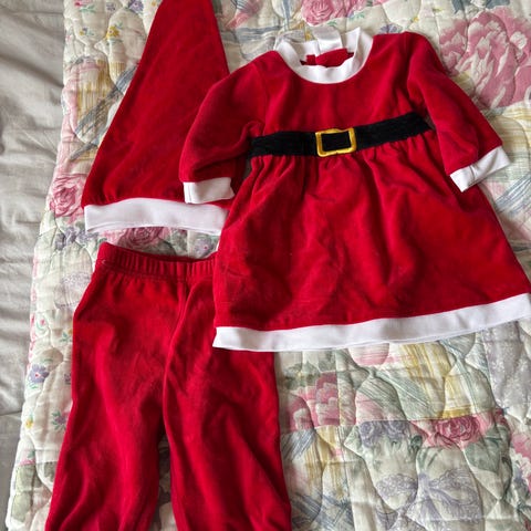 Två tomtedräkter i storlek 86/92 respektive 98/104 från Åhléns och hm. Fyra plagg totalt i fint skick, använt av två barn enstaka gånger.