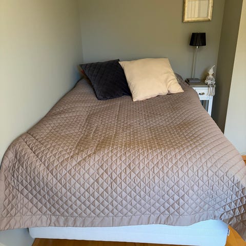Ramsäng (Hemnes från IKEA) med kontinentalsäng från Jysk som madrass.