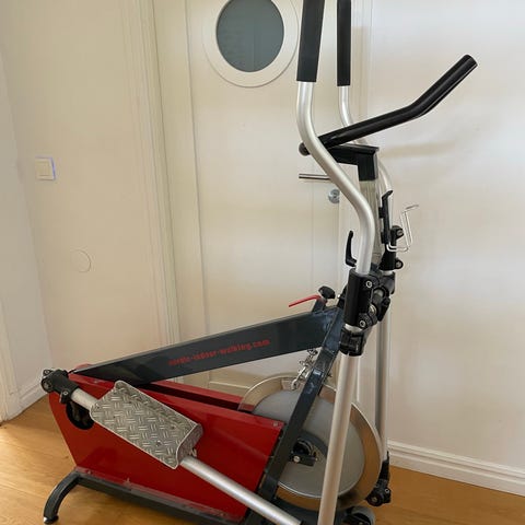Finnlo Crosstrainer träningsmaskin i grå färg. Utrustad med handtag och pedaler för helkroppsträning. Maskinen har en display för att visa träningsdata och justerbar motståndsnivå. Passar för hemmabruk. Behövs även att byta batterier.