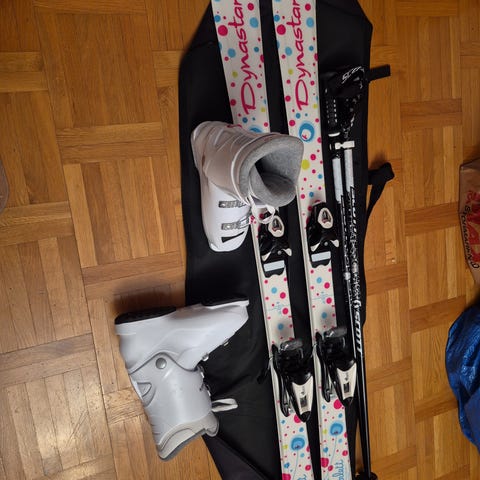 Slalomskidor och pjäxor dam. Skidorna är väl använda så det finns en repa här och där på belagen, men inget som märks när man åker. Innermått på pjäxorna är 24,5cm.