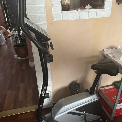 Merach MR-E4382-UK träningscykel i svart färg. Utrustad med justerbart motstånd och pedaler med remmar för stabil träning. Passar för hemmabruk och erbjuder digital display för övervakning av träningsdata.