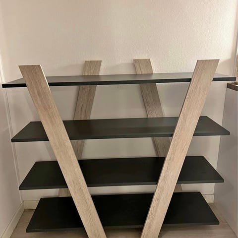 Hyllor med väggskenor, bärlist, konsoler, hyllplan och en klädstång.