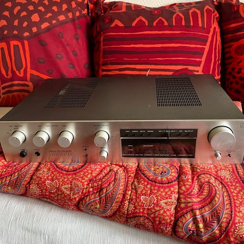 Den levereras med fjärrkontroll och användarmanual. Enheten är utformad för att hantera flera ljudkällor och används för hemmabio- och ljudsystem.