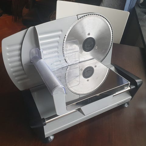 Elektrisk skärmaskin. Ställbar tjocklek på skivorna. Enkel att montera och ta isär för smidig förvaring. 200:-
