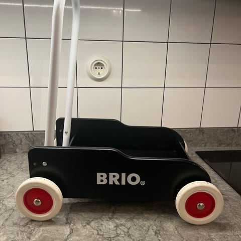 MICKI (ej Brio) gåvagn i trä med färgglad design. Barnvagnen har fyra hjul och är avsedd för barn. Tillverkad i trä med handtag för att underlätta barnets gångstöd.
