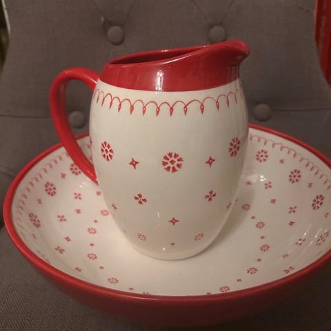 Antik porslinskanna och tvättfat med dekorativt rosmönster i rött och grönt. Setet inkluderar en kanna med handtag, ett stort tvättfat och en liten lockburk. Porslinet är vitt med gröna och röda detaljer. Används traditionellt för handtvätt och dekoration, märkt Göteborg