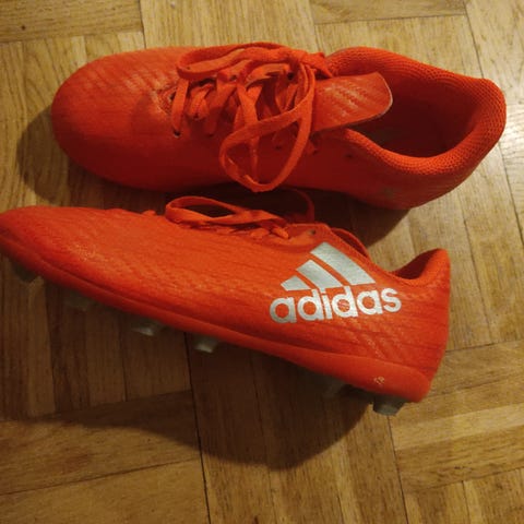 Adidas fotbollsskor för barn i storlek 31. Skorna är vita med röda detaljer och blå insida. De är tillverkade av syntetmaterial och har snörning för justerbar passform.