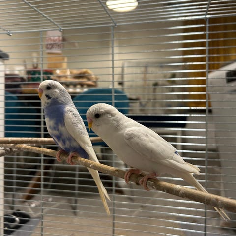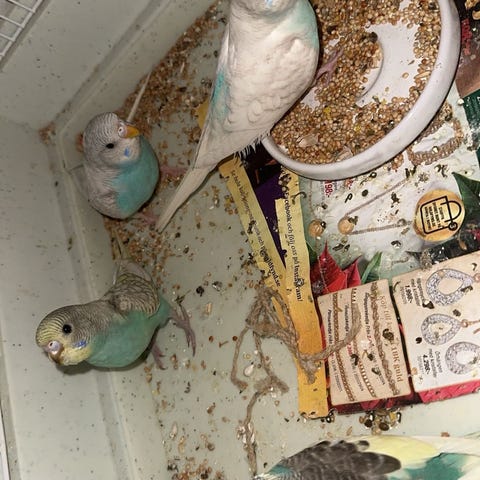 Fyra undulater i olika färger sitter tillsammans i buren. Två är klart gula, en är ljusgrå/gul och en är grön med mörkare teckningar. De sitter på sittpinnar nära varandra vid matskålen och verkar aktiva, nyfikna och trygga i sin miljö.