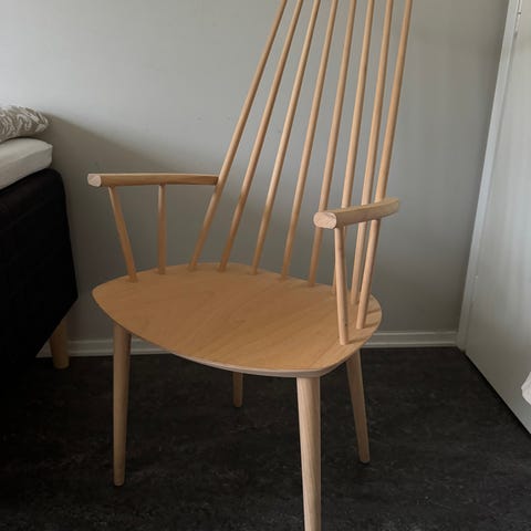 J41 stol från HAY är en pinnstol formgiven av Børge Mogensen som hyllar funktion och hantverk. Stag mellan benen ger stabilitet och hållbarhet, medan det något rundade ryggstödet och de brett fördelade pinnarna ger en bekväm sittupplevelse och en tidlös siluett. Enkelheten i formen gör att stolen smälter in i såväl matrum som läshörna och blir en trogen följeslagare i vardagens måltider och samtal. En klassiker som känns genomtänkt i både konstruktion och design. Det finns 50 st och de är alla i väldigt fint skick. Hämtas på Kammakargatan i centrala Stockholm. Du som företag kan få faktura av oss.