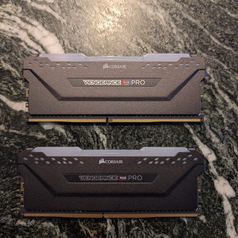 Corsair Vengeance Pro RAM-minne. Två minnesmoduler med 8gb ram var totalt 16gb. Används som datorminne för förbättrad prestanda.