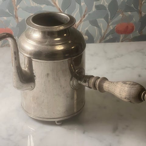 Antik kanna tillverkad i mässing med en lång pip och handtag. Kannan har en dekorativ design och en smal hals. Passar som prydnadsföremål eller för servering.
