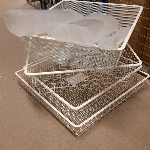 Metallhylla med tre hyllplan i svart färg. Hyllan har en enkel och funktionell design med ett ramverk i metall och tre hyllplan med speglar.