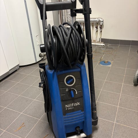 DeWalt högtryckstvätt med slangvinda och pistolhandtag. Utrustad med behållare för rengöringsmedel. Designad för effektiv rengöring med högtrycksvatten.
