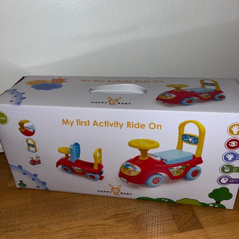Gåstol för barn med sittplats och aktivitetsbräda. Gåstolen har en ram i blått och ett sittdyna med grått och vitt mönster. Utrustad med leksaker och knappar för barnets underhållning.