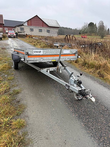 Professionell släpvagn för anläggnings- eller byggarbete som du vanligtvis hittar på bensinstationerna, med låg tyngdpunkt för högre säkerhet och stabila köregenskaper.