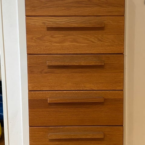 Små skav och märken här och var (har fotat det största märket) och nedre lådfronten är fastlimmad.