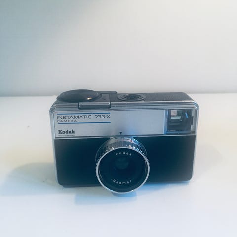 Kodak Instamatic 100 kamera med kompakt design. Kameran är utrustad med en enkel mekanism för filmframkallning och har en klassisk svartvit och silverfärgad kropp. Passar för användning med Instamatic-filmrullar.