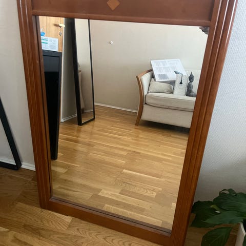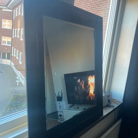 spegel med oval form och vit ram. Passar för inomhusbruk och kan användas i olika rum för dekoration och funktion.