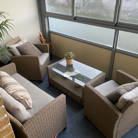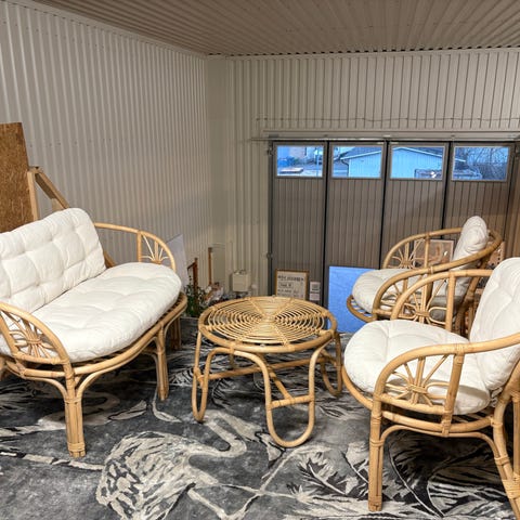 Superfin loungegrupp i konstrotting med beige dynor i toppenskick!