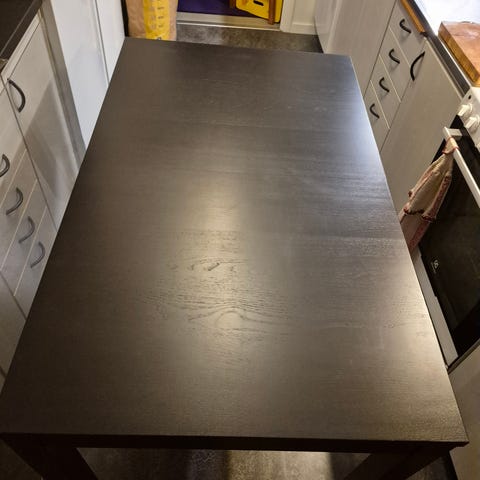 Köksbord, underrede i trä, perstorpsskiva, står stadigt, inga märken i skivan. Fint skick, två utdragbara skivor (båda går att fälla in, fotografen var lat bara)