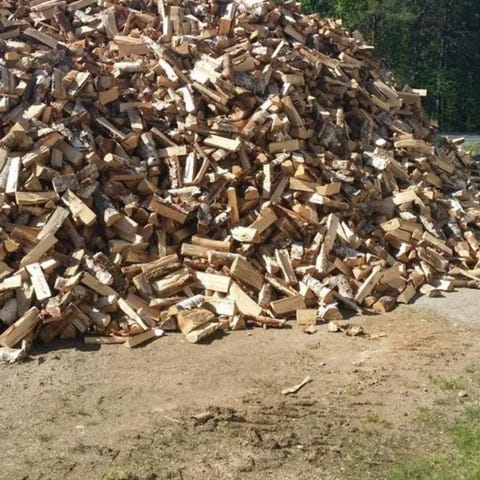 Ved i säckar lagrad utomhus, lämplig för uppvärmning och vedeldning. Säckarna är placerade på en öppen plats för enkel åtkomst och hantering.