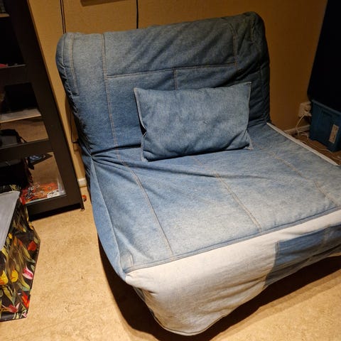 Bäddfåtölj, märke Brizley, i gråmelerat fint tyg, stickningar på armstöden. Sparsamt använd ser ut som ny. Supersmidig att bädda om tilll säng. Gedigen stomme i trä.
